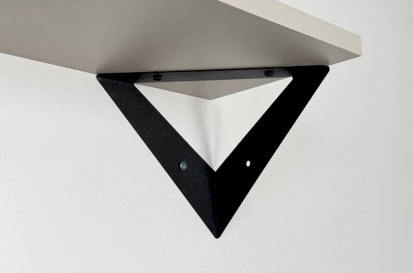 Полка крепится к стене с помощью чёрных треугольных держателей, которые обеспечивают устойчивость и долговечность. Особенность модели в том, что держатели можно расположить сверху, снизу или один сверху, другой снизу, что позволяет адаптировать полку под любые интерьерные решения и потребности.